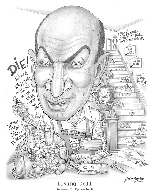 The leading man was pre-“Kojak” Telly Savalas as burly, cold-hearted Erich Streator, who married only for convenience. As the gentle yet no-nonsense mother Annabelle, Mary LaRoche was a good choice. She also played a mother in a one-scene part in Serling’s “Requiem for a Heavyweight” in 1956, and the sensible, pretty mistress in “A World of His Own” three seasons prior. Tracy Stratford (who played the daughter in “Little Girl Lost”) returned to play the daughter here as well. But who was Talky Tina? None other than June Foray – who did not receive screen credit, but the voice she provided (with the aid of perfect sound effects) gave a lasting impression. Bernard Herrmann’s last of eight scoring assignments for “Twilight Zone” was “Living Doll.” What he came up with was a wicked waltz in 3-beat time scored for bass clarinet, two harps, and celeste. The episode was also photographed very well, particularly the scenes where Streator tries to chop the doll’s head off with a table saw and burn her with a welding torch. No matter how hard he tries, nothing but nothing at all will scathe the ruthless Talky Tina. “And no one has dared forget it!” remarks June Foray.