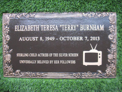 In late 2015, The Twilight Zone Museum was notified that Terry Burnham’s remains were being held in the LA County Crematorium, and were about to be discarded into an unmarked “common” grave. Although we chose not to acquire the remains, we knew that Terry needed a memorial marker of some sort. But what would it be? A posting was made on our Facebook page about raising funds for the marker. Within 2 months, more than $1,500 had been raised, and the Long Beach Press Telegram and LA Daily News decided to do an article about it which you can read here: Page 1 Page 2. But, the question remained – where would the marker be placed? One of the staff of Forest Lawn Cemetery contacted the LBPT newspaper and asked about how I could be reached. They contacted me and reported that Terry’s parents had already made a provision for her in their cemetery campus on San Antonio Dr. in Long Beach. But the provision was only a “holding” of the space where her remains and headstone would eventually go. The fundraiser generated just over the target amount of $3,500, from approximately 100 donors who donated anywhere from $5 to $300 apiece. A second fundraiser was conducted by others, over a period of 2 years, which raised $1,500 towards Terry’s burial costs. A headstone was purchased and placed in October 1st, 2016. Her cremated remains were interred in August, 2018. If you are a fan of Terry’s work in TV and film and happen to be in the Long Beach area, you can stop by and pay tribute to the great actress.
